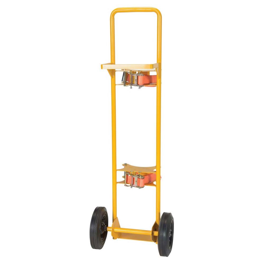 The Welding Tank Cart is a great addition to manufacturing and industrial facilities. The strong steel construction is perfect for transporting and holding single tanks. The included straps allow for safe maneuvering while transporting products. The cart contains a bright yellow finish that promotes visibility in the workplace. For best use, place the cylinder onto the cart in the proper working position. Once in place, increase the tension of the straps around the unit until the tank is secured.